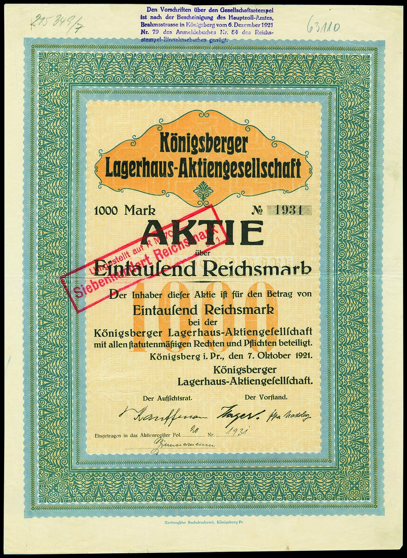 Königsberger Lagerhaus-AG. Aktie über 1.000 Reichsmark. Königsberg, 7. Oktober 1921. Blau/gelbbraun. Nr. 1931. Lagerhaltung, Bearbeitung und Verladung von Getreide und Gütern aller Art sowie die Ausführung aller damit im Zusammenhang stehenden Geschäfte. Gegründet am 6.5.1896. Das Lagerhaus der Gesellschaft wurde am 1.8.1097 in Betrieb genommen und von ca. 39.000 t Fassungsraum 1911/12 auf ca. 60.000 t durch einen Erweiterungsbau vergrössert; damit besass die Gesellschaft den grössten Getreidespeicher des Kontinents. VF.