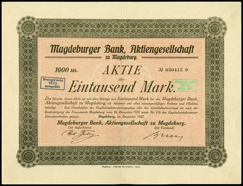 Magdeburger Bank AG. Aktie über 1.000 Mark. Magdeburg, im Dezember 1922. Rotbraun/braun. Nr. 30415. Unentwerteter Titel. Gegründet 1922 durch Übernahme der Magdeburger Creditbank. Bereits 1925 wurde die Liquidation eingeleitet. VF.