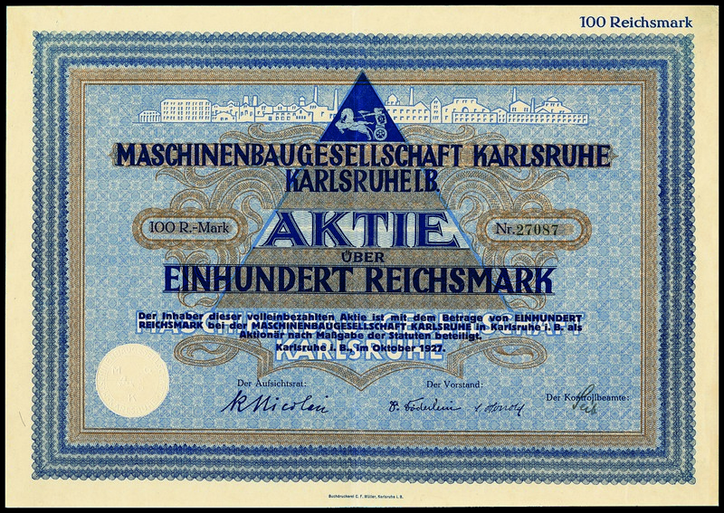 Maschinenbaugesellschaft Karlsruhe. Aktie über 100 Reichsmark. Karlsruhe i.B., im Oktober 1927. Braun/blau. Nr. 27087. Gründung 1852. Eisen- und Metallgiesserei, Kesselschmiede. Bis 1929 auch Lokomotivbau. Verkauft an die Hohenzollern AG in Düsseldorf. Unentwertet. EF.