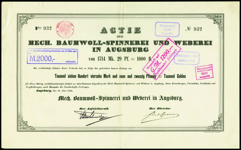 Mech. Baumwoll-Spinnerei und Weberei in Augsburg. Aktie über 1.714 Mark und 29 Pfennig oder 1.000 Gulden. Augsburg, 16. Juni 1896. Nr. 932. Die Konstituierung zur Errichtung einer Spinnerei und Weberei erfolgte im April 1837 mit dem Zweck, die Baumwollindustrie nach erfolgter Gründung des Zollvereins auch in Bayern einzuführen. Im August 1840 kam das Werk in Betrieb. Am 28. Oktober 1862 erfolgte die Umwandlung in eine AG. Das Werk gehört seit seiner Gründung zu den bedeutendsten Betrieben der Textilindustrie. Der aus der Umrechnung der Guldenwährung herrührende krumme Markbetrag beim Nennwert wurde durch Aufzahlung auf 2.000 Mark beseitigt. Vier Jahre später war die Mark wegen der Inflation dann wirklich nichts mehr wert. Nur 1 Stück im Barov. VF.