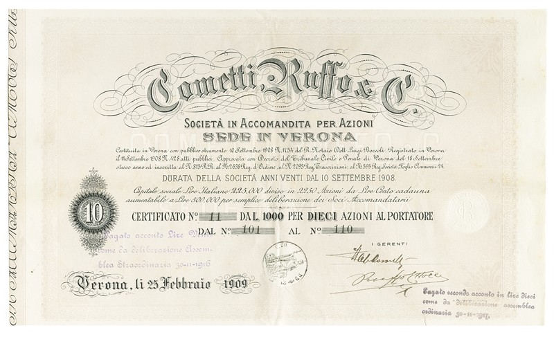 Cametti, Ruffo & C. Azione 10 da 100 L., Verona, 25. Febbraio 1909. Nr. 11/101-110. EF.