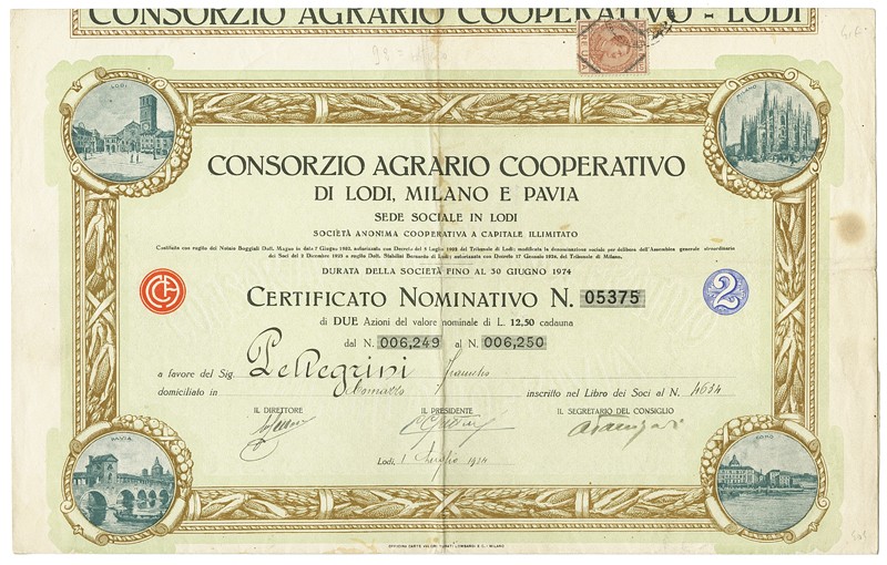 Consorzio Agrario Cooperativo di Lodi Milano e Pavia. Azione 2 da 12,50 L., Lodi, 1.luglio 1924. Nr. 5375. Stains along the fold. VK. Five different denominations. In the border illustrations from Lodi, Milano, Pavia and Como.