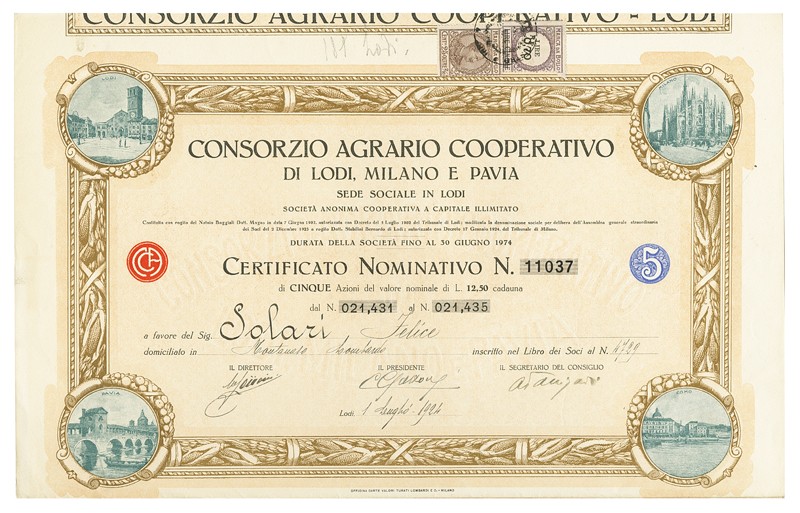 Consorzio Agrario Cooperativo di Lodi Milano e Pavia. Azione 5 da 12,50 L., Lodi, 1. Luglio 1924. Nr. 11037. EF. Five different denominations. In the border illustrations from Lodi, Milano, Pavia and Como.