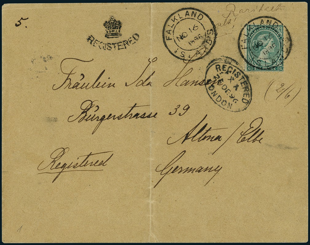 1896, Nov. 16. Registered envelope with cachet, on reverse, of the Port Stanley Agency of the German Kosmos Steamship Co., addressed to Altona (Germany), franked by 6d. blue-green, tied by type F2 c.d.s., showing neat crowned "Registered" handstamp and "Registered/London" datestamp alongside, backstamped on receipt. Apparently carried on the outward voyage of the "Ramses". Scarce. S.G. 3.
