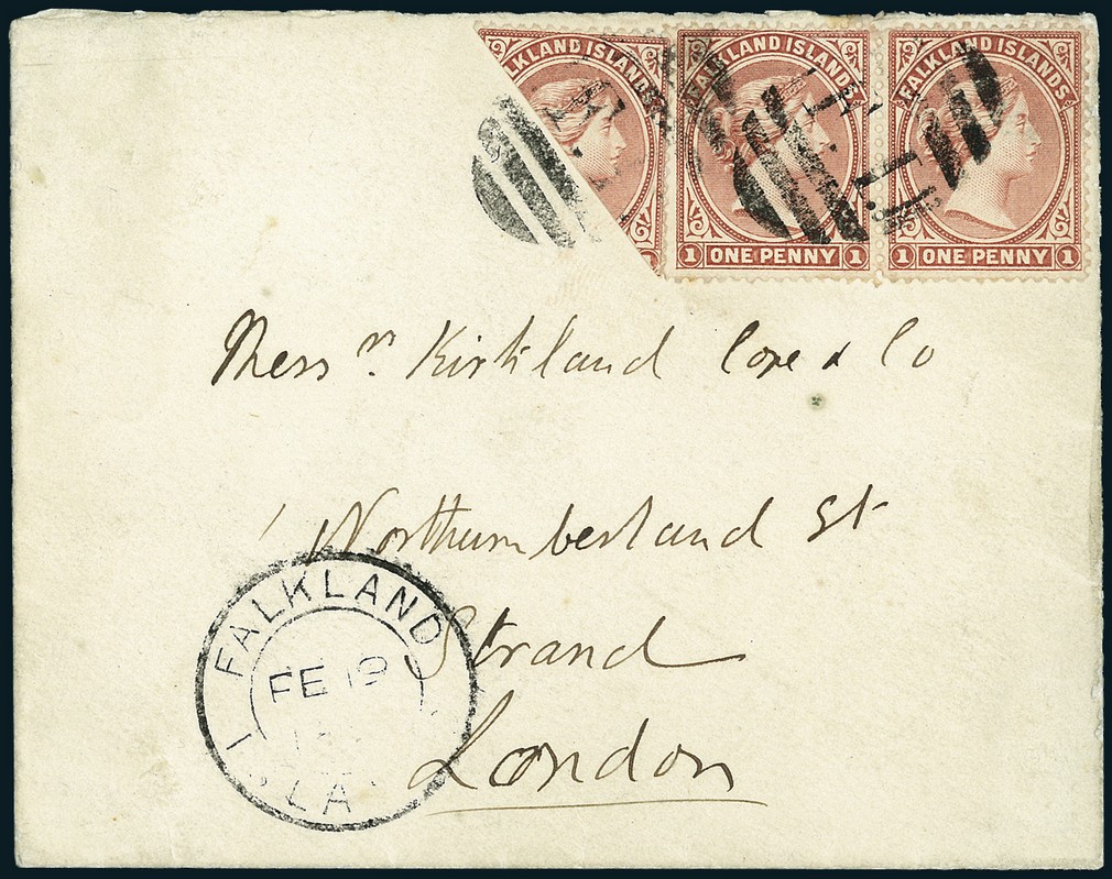 1891, Feb. 19. Cover to London franked at the, recently introduced, 2 1/2d. rate, by 1885-87 1d. brownish claret, upper right diagonal half and horizontal pair, tied by fine strikes of "F.I." barred steel obliterator (Barnes Ob. 1/78), and dispatch c.d.s. at base, backstamped on arrival. The SS "Pentaur" of the Kosmos Line sailed from Port Stanley on 26.2.1891 and connected with the SS "Liguria" of the PSNC at Punta Arenas (Chile), arriving in London on 12.4. One of the finest bisect covers known, further enhanced by the "F.I." obliterator, which was used on only two mailings during the bisect period. Cert. BPA. S.G. 8, 8a.