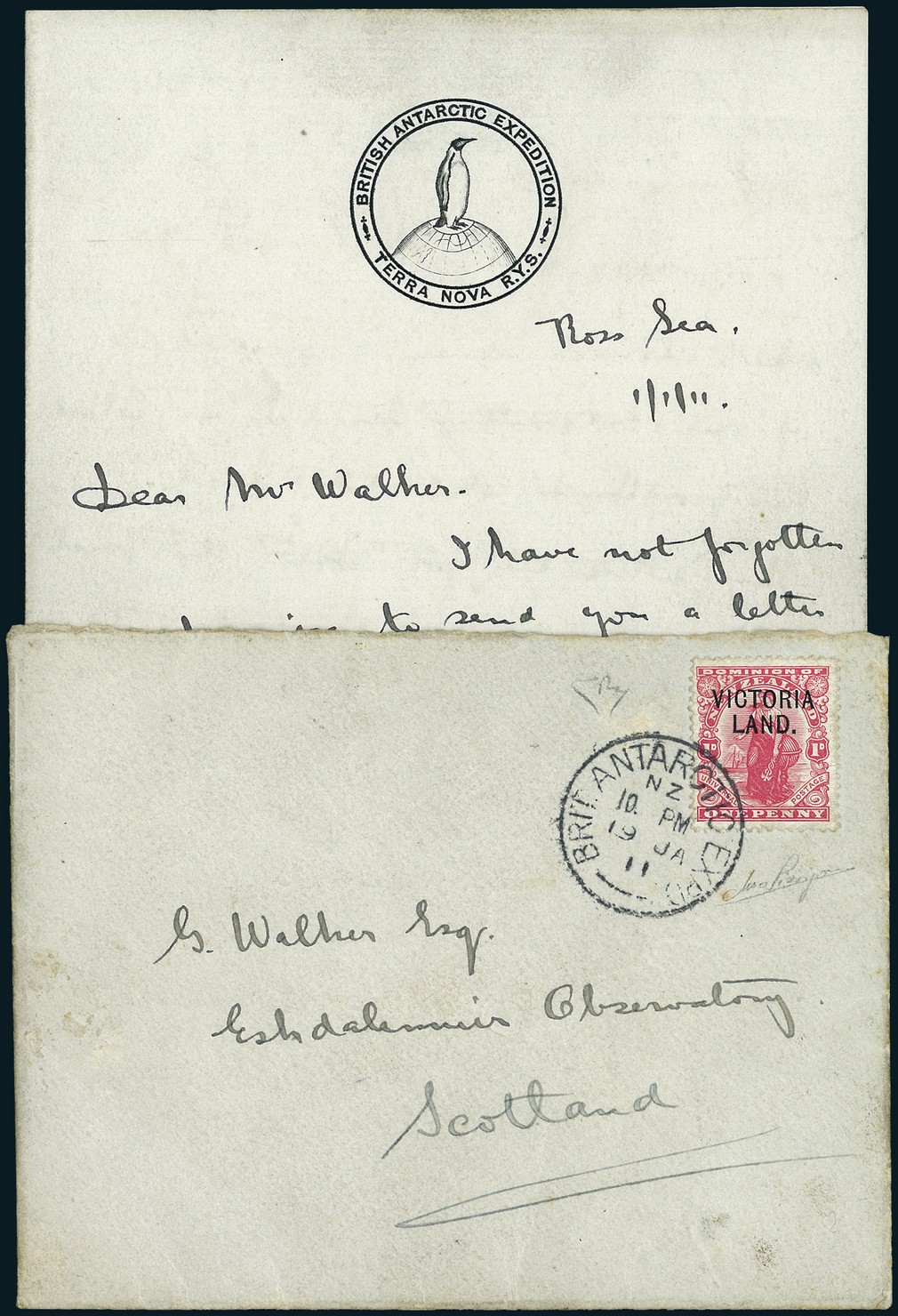 1910-13 British Antarctic Expedition by Scott. Expedition crested stationery cover and letter bearing Victoria Land 1d. carmine, tied by "Brit. Antarctic Exps." c.d.s. Full original contents from George Simpson (later Astronomer Royal) detailing a hazardous journey to Ross Island. Crested flap of the cover detached after opening. Also a "caution" slip which was then contained in this envelope, forbidding publication of any information of the expedition to press, publishers or general public. A fine and interesting first mail of this Expedition from the Antarctica. Cert. Enzo Diena.