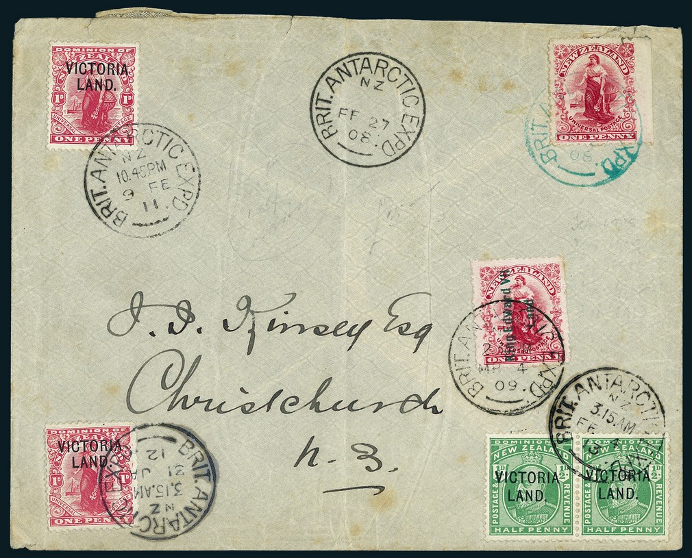 1908-13. Transition cover with "British Antarctic Expedition 1907." imprint on back flap, with "Brit. Antarctic Expd." datestamps from 1908 (Shackelton Expedition) tying (27.2.1908), in blue-green, New Zealand 1d., with a further strike in black alongside, then K.E. VII Land 1d. tied on 4.3.1909, following 1911 first mail with Victoria Land 1d. tied on 9.2.1911, a further Victoria Land 1d. cancelled on 31.1.1912, as well as Victoria Land 1/2d. used on 4.2.1913. The two Victoria Land 1d. values with "no stop" variety. Addressed to 1911-14 Australian Expedition agent Kinsey as a souvenir. Some imperfections hardly detracting from this desirable and most interesting cover documenting different British expeditions.