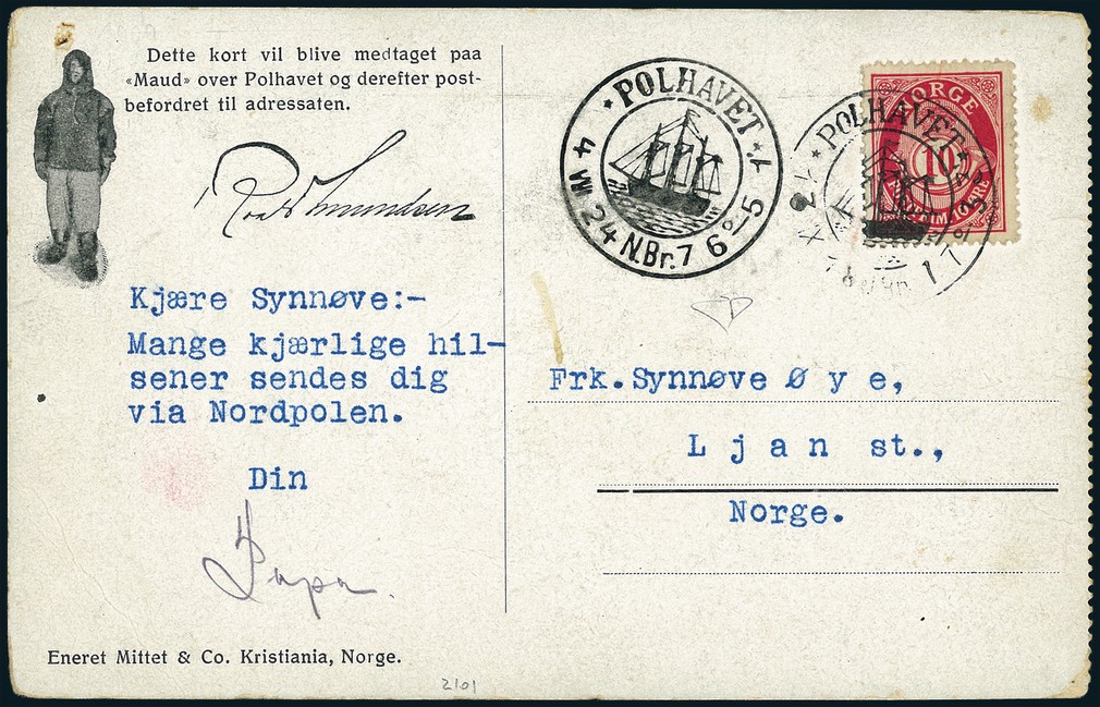 1918-24 Amundsen Arctic Expedition. 11 "Fram" and one "Maud" (cert. Enzo Diena) postcards (three different pictures) with Norwegian frankings showing 1918 and 1924 "Polhavet" cds's. Also cover bearing Norway 1925 complete issue for Amundsen's attempeted flight to the North Pole, tied by "Roald Amundsen / 14. Desember 1928" roller cancel.