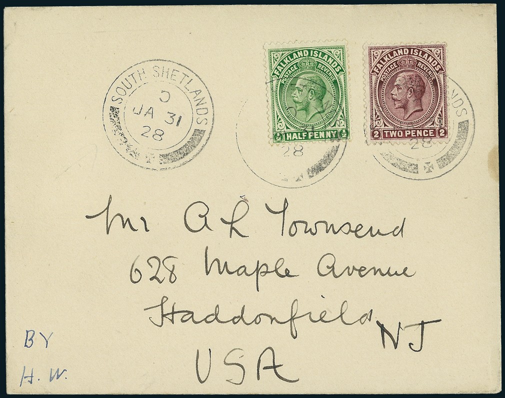 1928-30 Wilkins-Hearst Antarctic Expedition. 1928, Jan. 1 - 1929, March 5. Two "Townsend" covers to United States, each endorsed "BY/H.W." denoting provenance from the Wilkins Antarctic Expedition, the earlier bearing Falkland Islands 1921-28 1/2d. and 2s., the other franked by 1921-28 2 1/2d., both showing South Shetlands (type B2) c.d.s., one featuring the code "C" inverted. Scarce mails carried at correct foreign rate.