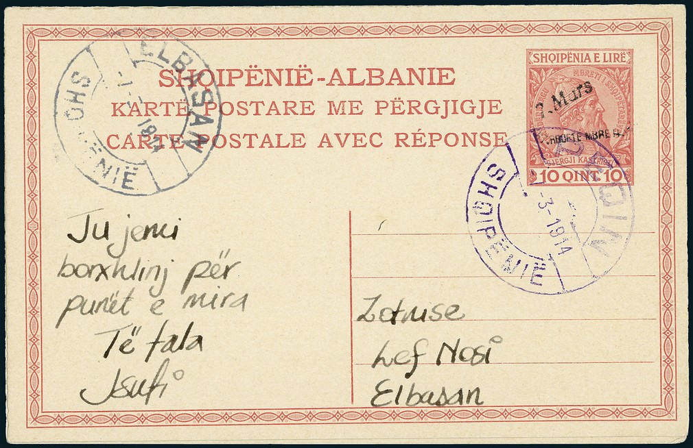 1914, Arrival of Prince William 10q. + 10q. reply paid card, the outward portion used from Peqin to Elbasan. Rare, with only 100 examples overprinted. Cert. Graf. Mi P10.
