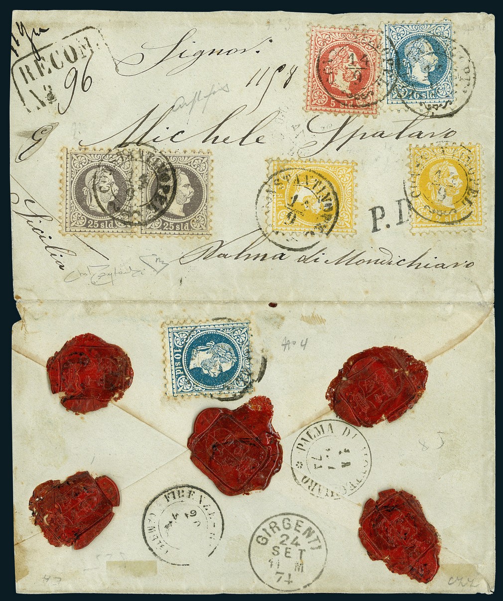 Constantinople. 1874, Sept. 14. Registered envelope (slightly reduced at left and opened for display) to Palma di Montechiaro (Sicily), being an unusual destination within Italy in this field, paying a 79 soldi rate with 1867 2s. orange (2), 5s. red, 10s. blue (2) and 25s. violet in pair, each tied by "Constantinopel" c.d.s. (Tchilinghirian fig. 386), exhibiting Italian transits and arrival on reverse. Trivial soiling around edges of some adhesives from gum. A very scarce and desirable four-colour franking. Cert Enzo Diena, signed Fiecchi and Raybaudi. Mi. 1Ia, 3Ia, 4Ia, 6Ib.