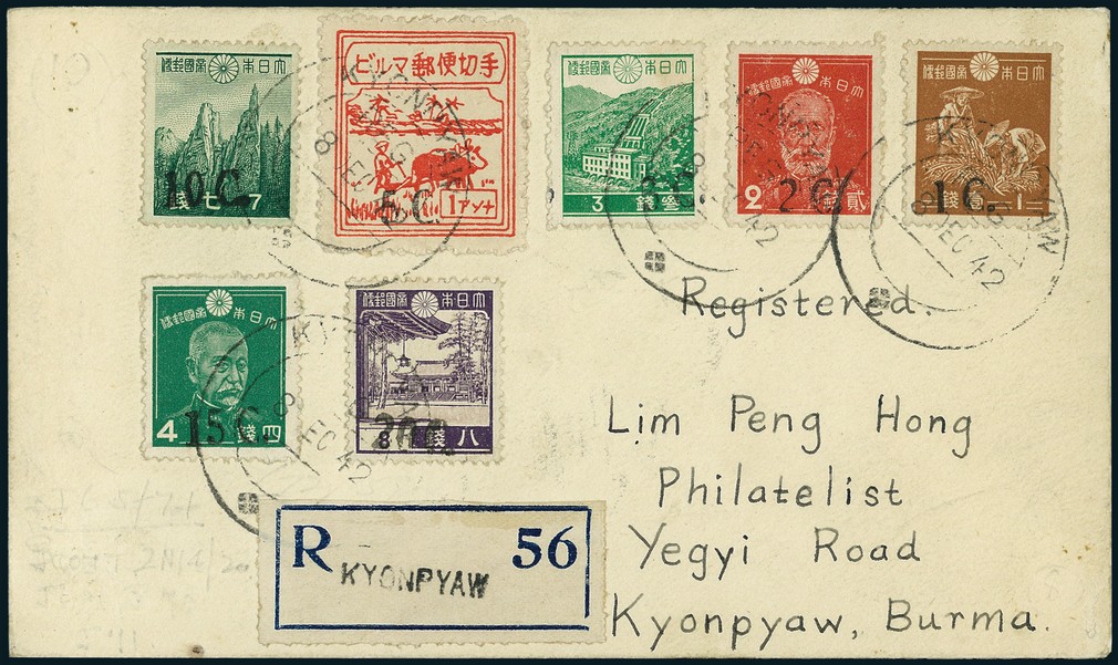 1942, Dec 8. Registered "Lim Peng Hong" cover, locally addressed at Kyonpiaw, bearing "Farmer" 5c. on 1a., as well as Japanese values including six different values (complete set in absence of 5c. on 5s.), tied by "Kyonpyaw/Reg" c.d.s. accompanied by registration label below. A rare combination franking. S.G. J57, 65-67, 69-71.