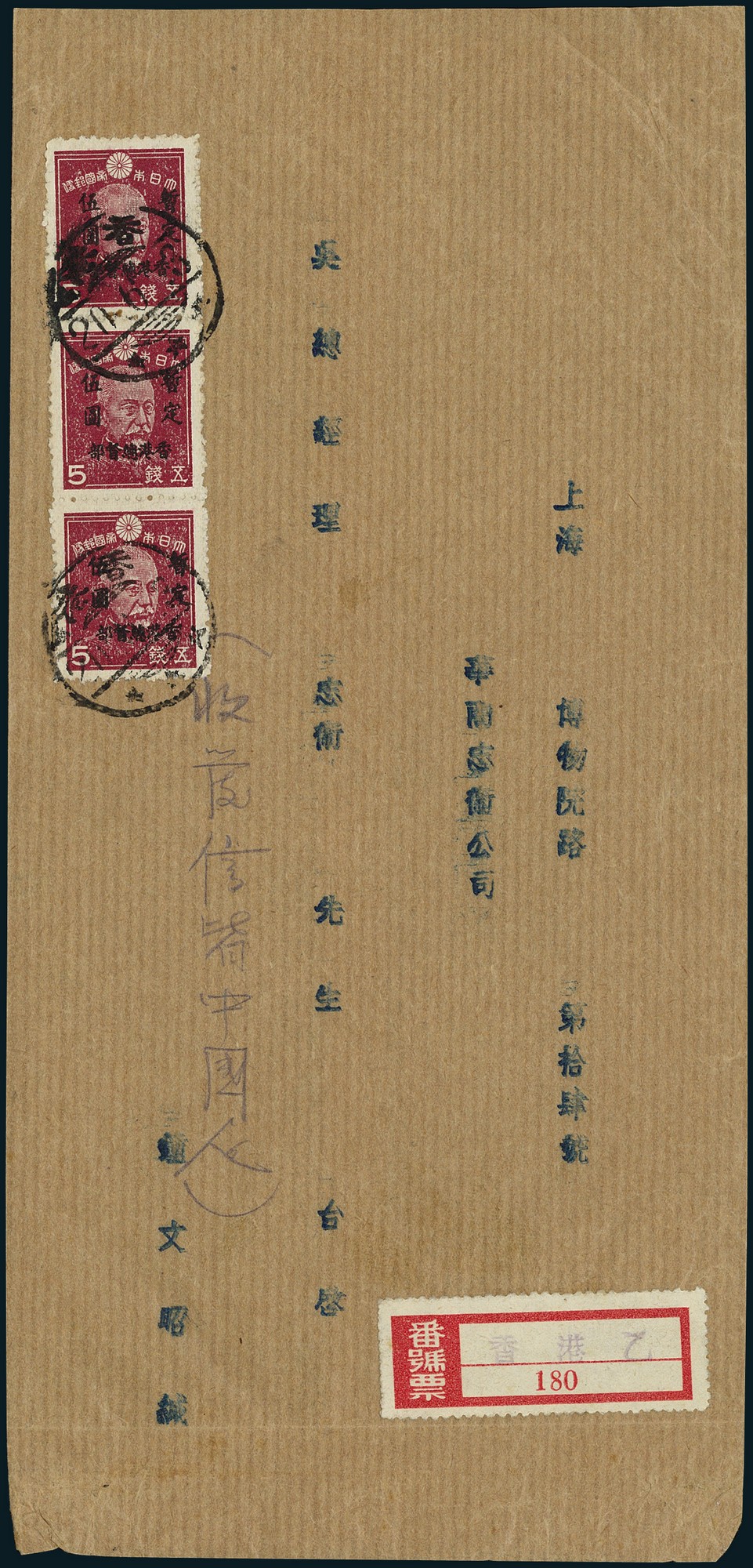 1945, June 3. Commercial registered envelope bearing 5yen on 5s. claret, vertical strip of three, tied by Japanese "Hong Kong GPO" c.d.s., with red registration label alongside. A rare franking. S.G. J3.