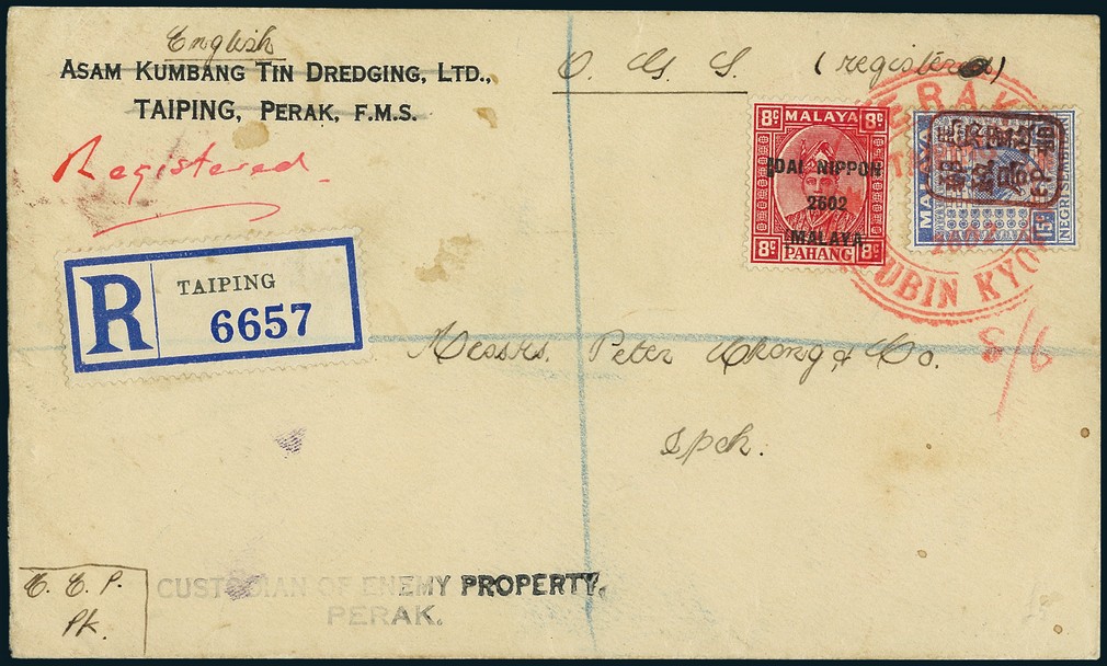 1942, June. Two registered envelopes, each franked by Negri Sembilan 15c., (one with chop "E" in red brown, the other with chop "F" in red), and Pahang 8c. (type 16). One cover originates from Taiping and was directed to Ipoh with large red "Perak/Taiping/Yubin Kyoku" c.d.s.; the other, locally addressed within Ipoh, with "Perak/Ipoh/Yubin Kyoku" c.d.s. S.G. J169, J241.