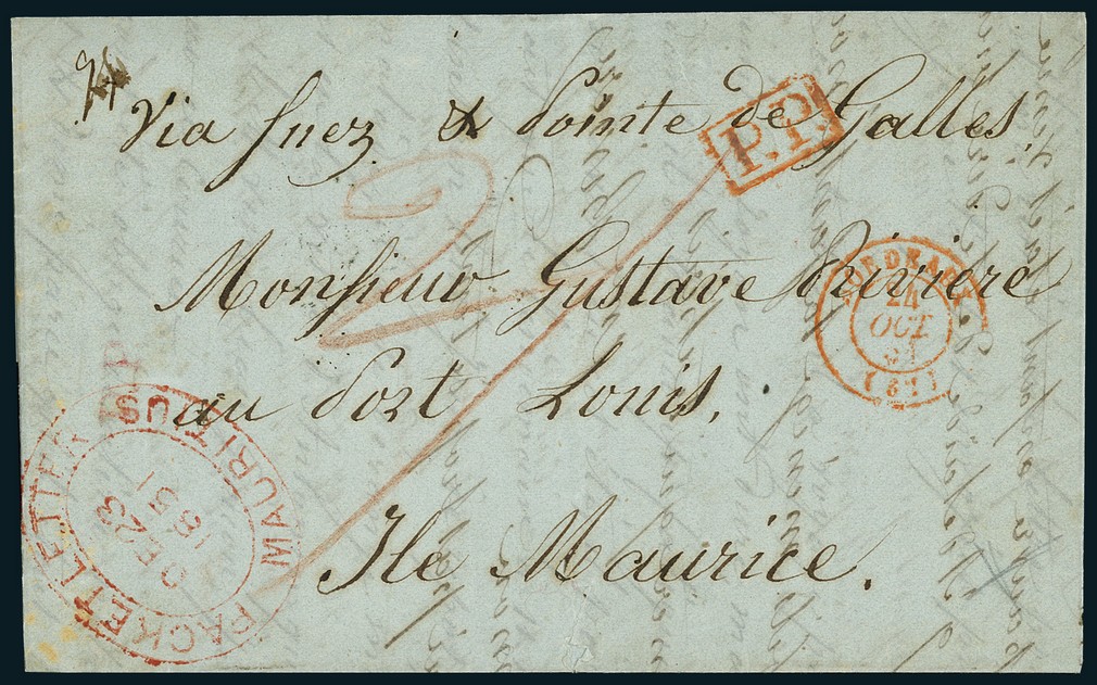 1851, Oct. 23. Entire letter from Bordeaux to Mauritius, showing framed "P.P." and Bordeaux dispatch c.d.s., both in red, and clean strike of "Packet Letter/De23-1851/Mauritius" double oval datestamp.