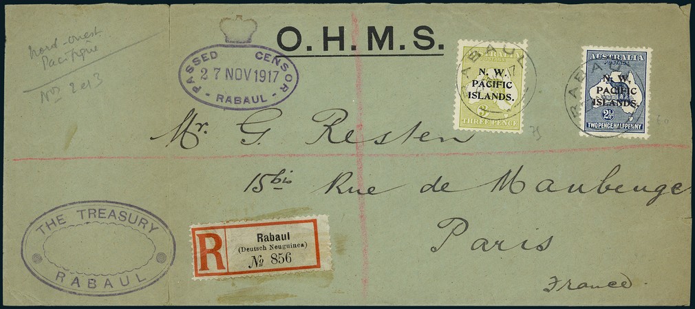 1916-17. Two censored covers registered from Rabaul bearing N.W. Pacific Islands overprinted adhesives, one directed to Bradford with 2 1/2d. indigo pair, the other being a large O.H.M.S. envelope (slightly reduced at right) addressed to Paris with "The Treasury/Rabaul" marking and franked by 2 1/2d. indigo and 3d. yellow-olive. A scarce duo.