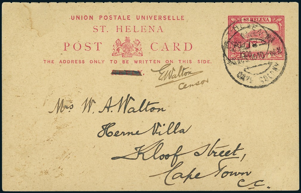 1881-1900. Two items including cover to Scotland bearing 1876 1s. deep green tied by cork cancel with "6" rate mark in red crayon; 1d. carmine reply-postcard to Cape Town, written by the censor E. Walton at Deadwood Camp with "E.Walton/Censor" in manuscript (instead of usual BW1 censor mark). S.G. 26