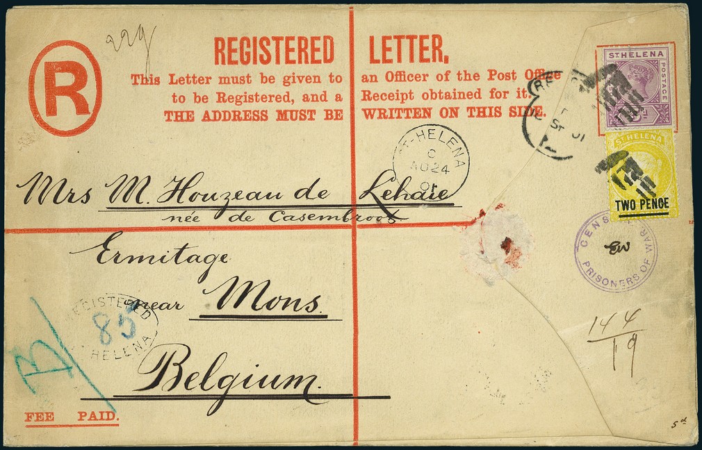1901, Aug. 24. Formula registered envelope from St. Helena to Mons (Belgium), franked by 2d. yellow and 5d. mauve, each tied by cork cancel with, alongside, St. helena and registration datestamps, as well as P.O.W. censor mark. S.G. 39, 51.
