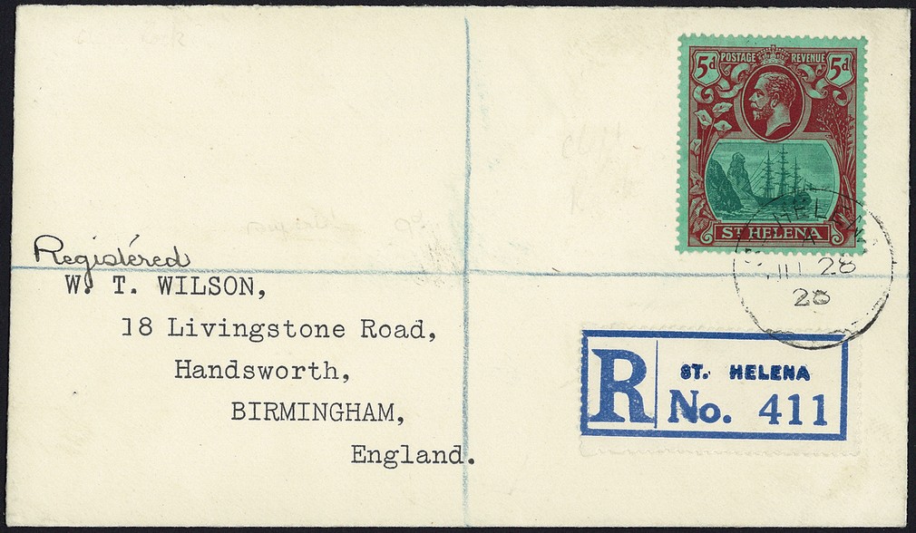 1923-28. Three "Wilson" registered covers to Birmigham exhibiting 1922-37 values, one with 1/2d., 1 1/2d., 2d., 3d. ("torn flag" variety) and 8d; the second bearing 1d., 6d. and 1s.; with the third showing single franking of 5d. featuring "cleft rock" variety (only 1,039 stamps were printed, being rare on cover). A most attractive trio. S.G. 97-100, 101b, 103c, 104-106.