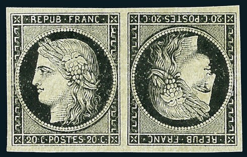 1849, 20c. black, tête-bêche pair, heads back-to-back, showing a detailed impression and specially intense colour, with large balanced margins on all four sides, with original, slightly cracked, gum. A wonderful example of this rare and fascinating variety. Maury 3tb.