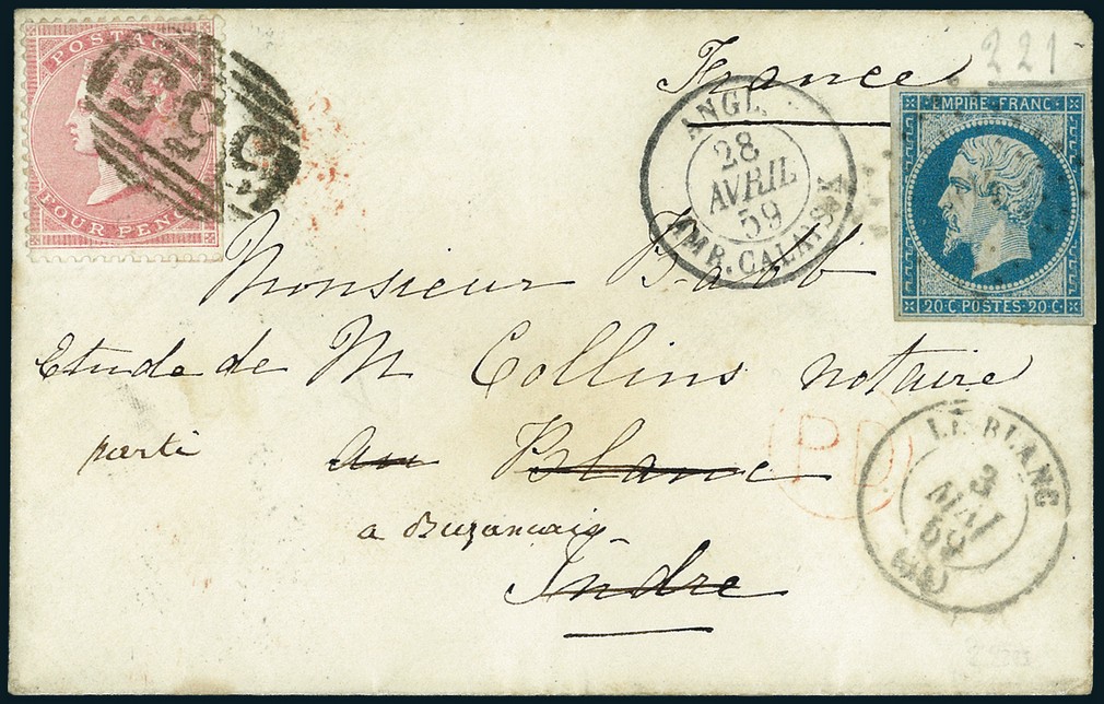 1859, April 27. Envelope to Le Blanc (France), correctly franked according to the single rate introduced on 1.1.1855, with Great Britain 1857 4d. rose-carmine, perforations partly trimmed by scissors at right, tied by "355" barred oval with matching Henley-on-Thames c.d.s. on back, together with London and and French transit c.d.s.'s. On arrival, it was directed to Buzançais by the application of 1854 20c. blue, type I, tied by dotted lozenge with corresponding Le Blanc c.d.s. at base. A rare combination franking. Cert. Scheller. Maury 14I.