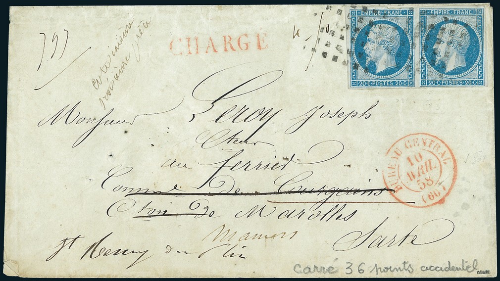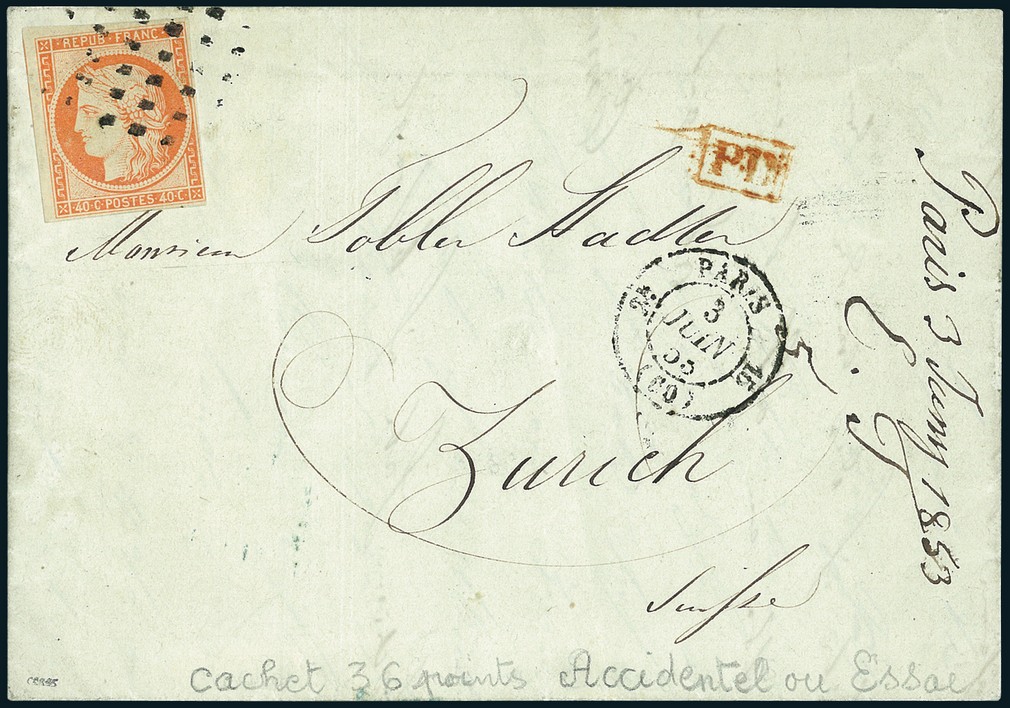 1849-70. Selection of 20 covers mainly featuring better shades and cancellations, with 1849 20c. tied by red "C" within circle of Caux, 20c. marginal example, 25c. pair paying the scarce overland rate to Sardinia, 40c. tied by 36 points essay-cancellation; 1854-61 20c. pair on registered mail and 40c. single franking with both covers featuring 36 points cancel, 80c. with "stars" postmark; Bordeaux Issue including 1c. single franking on printed matter mail with pair and two single frankings, rare 5c. single franking, 5c. & 10c. tied by "OR" cancel, 10c. yellow-lemon single franking, marginal 40c. single, 40c. pair on cover from Alexandria, very scarce 80c. on cover to Constantinople, etc. Viewing required.