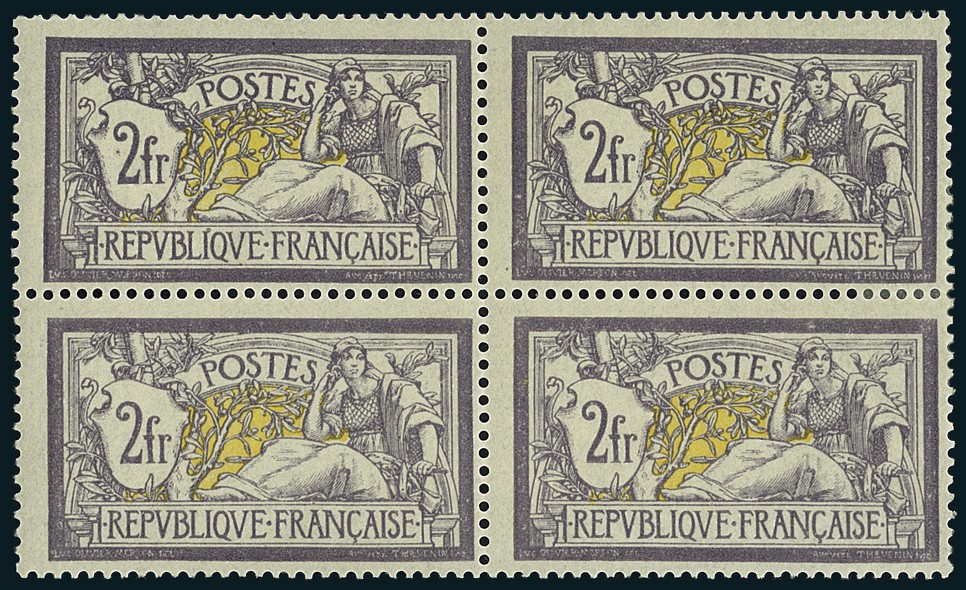 1900, "Merson" type, 2fr. violet and yellow, a very fine block of four with only one hinge mark at right and usual centring. Maury 122 = € 6'900+.