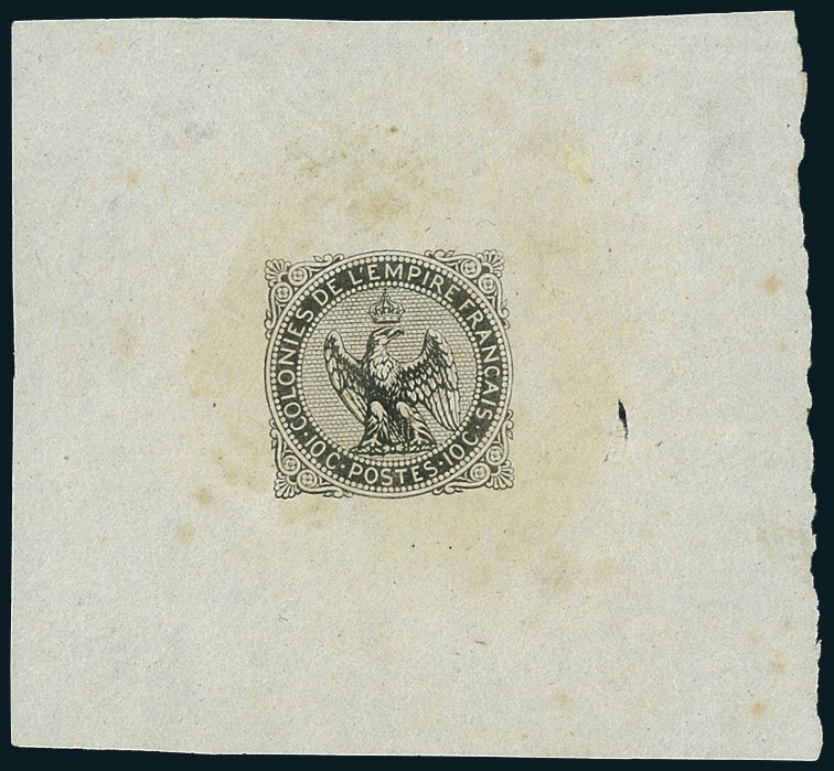 1859, 10c. black, Die Trial Colour Proof (3P), fine and fresh, with some light toning and small hole at right, well away from design. Rare.