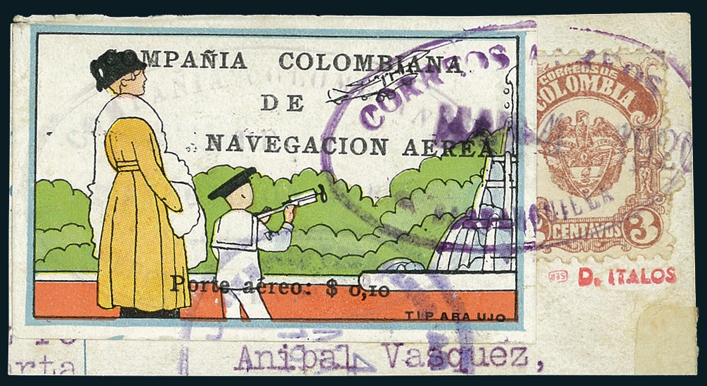 1920, 10c."Woman and Boy Watching Plane", used on small piece of postcard, together with Colombia 3c. tied, on the return flight, by "Correos Aéreos/Mar 4 1920/Barranquilla" oval datestamp as well as c.d.s. on dispatch. Only 20 examples used off cover are recorded. Scott C2. Ex Augusto Peinado.