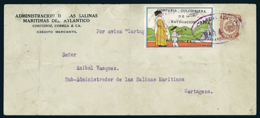 1920, 10c. "Woman and Boy Watching Plane", on commercial envelope carried on the Return Flight from Barranquilla to Cartagena, cancelled by "CCNA/Agencia Barranquilla" oval cachet and tied, together with National Post 3c., by "Correos Aéreos/Mar 4 1920/Barranquilla" oval datestamp, both applied in violet. Some creases not impinging on the franking. 11 covers exhibiting this vignette are recorded from this flight. Scott C2.