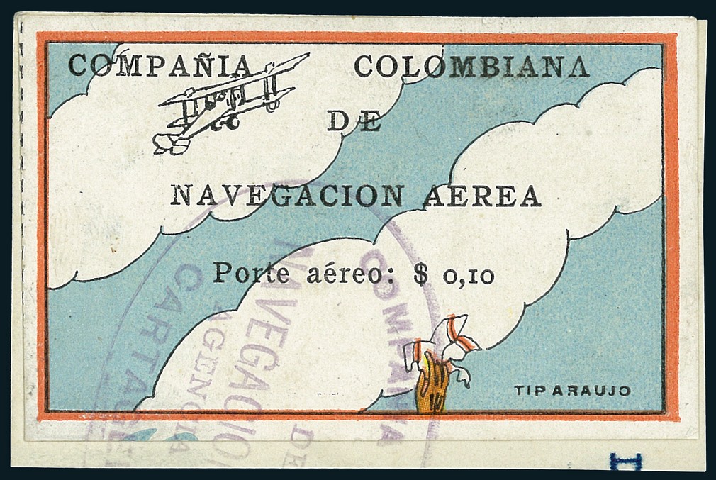 1920, 10c. "Clouds and Biplane", large even margins all around, delicately tied by "CCNA/Cartagena" oval datestamp to piece. A delightful example. Scott C3.