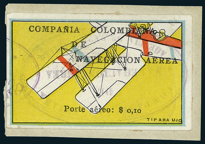 1920, 10c. "Tilted Plane", featuring colourless flaw in "O" of "Compañía", a fresh example on piece showing "CCNA/Agencia de Barranquilla" oval handstamp on the return flight of 4 March 1920. Slight wrinkle at top right, this being a minor blemish which plague these vignettes. 23 used vignettes off cover known. Scott C4.