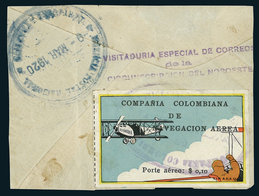 1920, 10c. "Flier in Plane Watching Biplane", a very fine example exhibiting large margins all around and bright colour, tied by "CCNA/Agencia Barranquilla" oval handstamp, showing National Post c.d.s in blue of Cartagena dated 9 March 1920 and three-line "Visitaduría Especial de Correos/de la/Circunscripción del Noroeste" handstamp in violet from the post. The only philatelic proof in existence corroborating the Barranquilla to Cartagena Return-Flight of 7 March 1920. Of great desirability and significance. Scott C5. Ex Örjan Lüning.