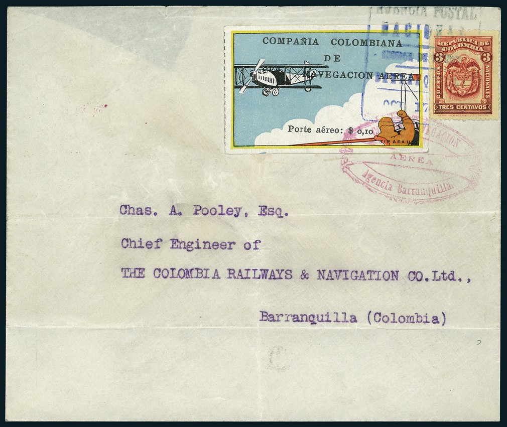 1920, 10c. "Flier in Plane Watching Biplane", a large margined example used on 17 October cover to Barranquilla, upfranked for the single rate with National Post 3c., both tied by "CCNA/Agencia Barranquilla" handstamp in purple and framed National Postal Agency datestamp in blue, showing "OCT 17" date. Three creases of which one passess through the vignette, without significance for this unqiue item. The pilot, Captain René Bazin, in a letter dated 18 June 1962, corroborated to have completed flights in October 1920: "During the month of October (1920) I have realized various flights over the mountains with twelve passengers". This is the only recorded cover which have survived from the flights in October -very few other vignettes on piece, exhibiting these cancellations, are also recorded (see lots 1004 & 1013)-. A very desirable gem of this issue representing a very late flight. Cert. Behr. Scott C5.