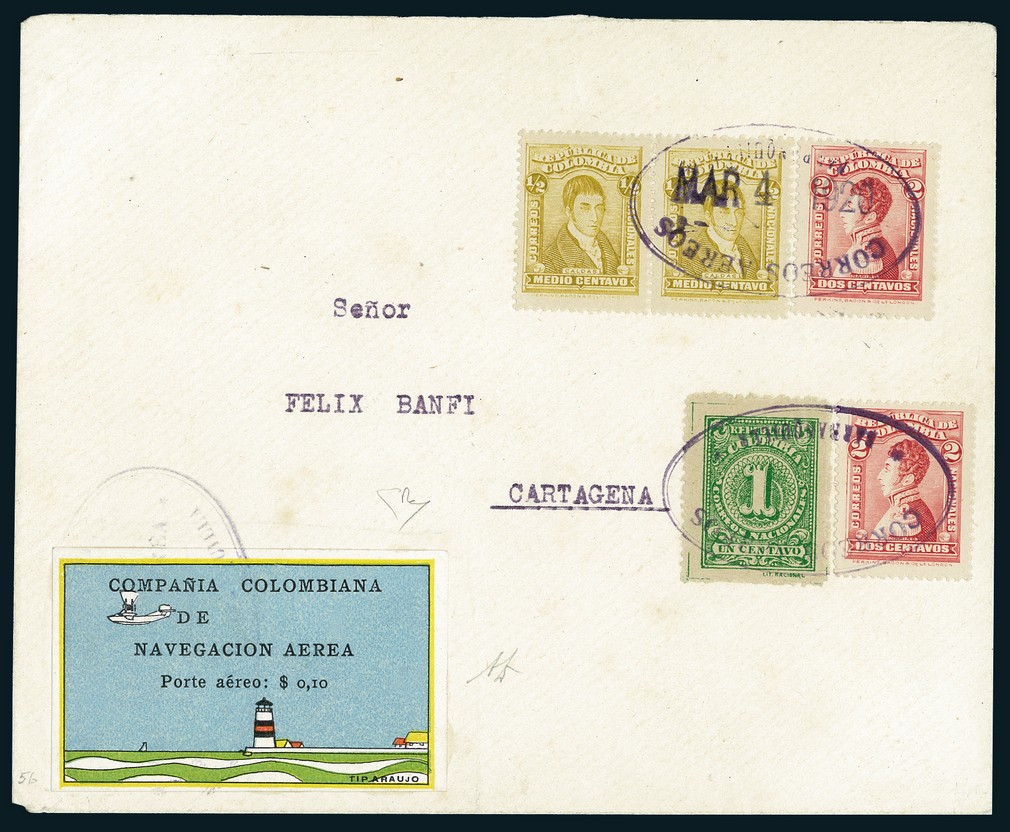 1920, 10c. "Lighthouse and Biplane", a very fresh example tied by very slight strike of "CCNA/Agencia de Barranquilla" oval in violet, on cover to Cartagena uprated by National Post 1/2c. pair, 1c. and 2c. (2), tied by "Correos Aéreos/Barranquilla" oval handstamp with inserted date of 4 March 1920, backstamped on arrival. A very fine example of the only seven covers known from the Second Flight and exhibiting this vignette, this being carried at double rate. Signed A. and Enzo Diena. Scott C6. Ex Augusto Peinado.