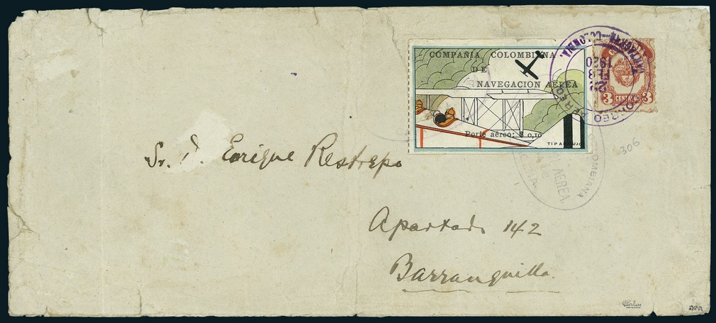 1920, "Fuselage and Tail of Biplane", on First-Flight large envelope from Cartagena to Barranquilla, tied by "CCNA/Cartagena" oval handstamp, with National Post 3c. adjacent, both stamps being tied by "Correo Aéreo./Cartagena-Colombia." c.d.s. Hardly visible wrinkle in upper left corner of the vignette and peripheral imperfections to cover. Considering the total amount (57) of used and unused examples as well as vignettes applied on cover, this is the rarest of the nine different CCNA vignettes. The number of covers with this vignette carried on this flight which have survived is 10. Signed Calves. Scott C7.