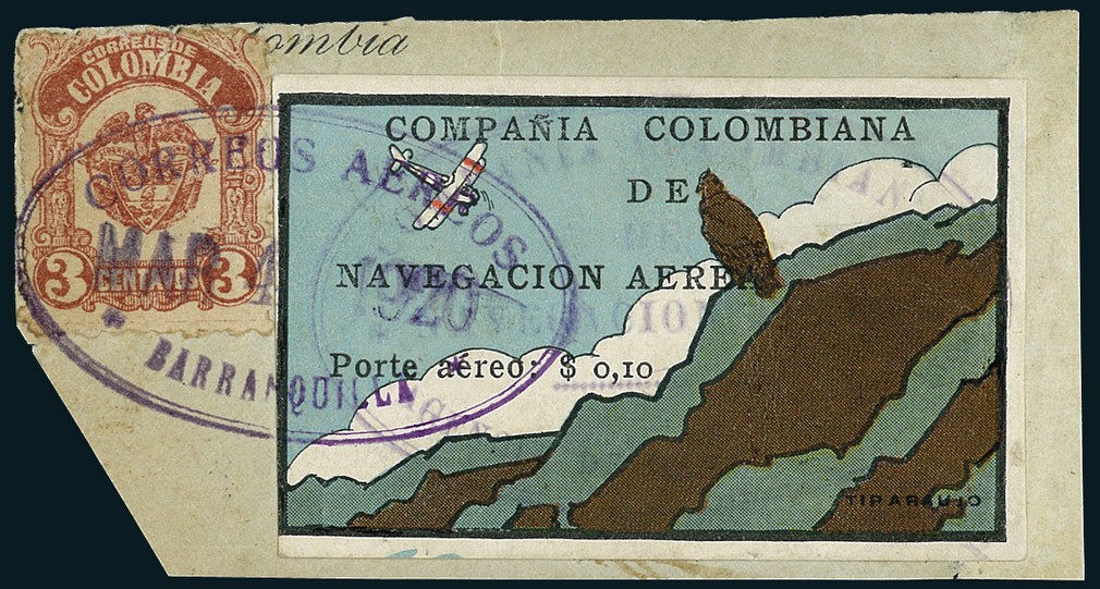 1920, 10c. "Condor on Cliff", touched at left following the norm, cancelled by "CCNA/Agencia de Barranquilla" cachet on piece, accompanied by Colombia 3c., both tied by "Correos Aéreos/Mar 4 1920/Barranquilla" oval handstamp. Usual wrinkles are to be expected in these vignettes. Only 15 used examples off cover have been recorded. Scott C8.