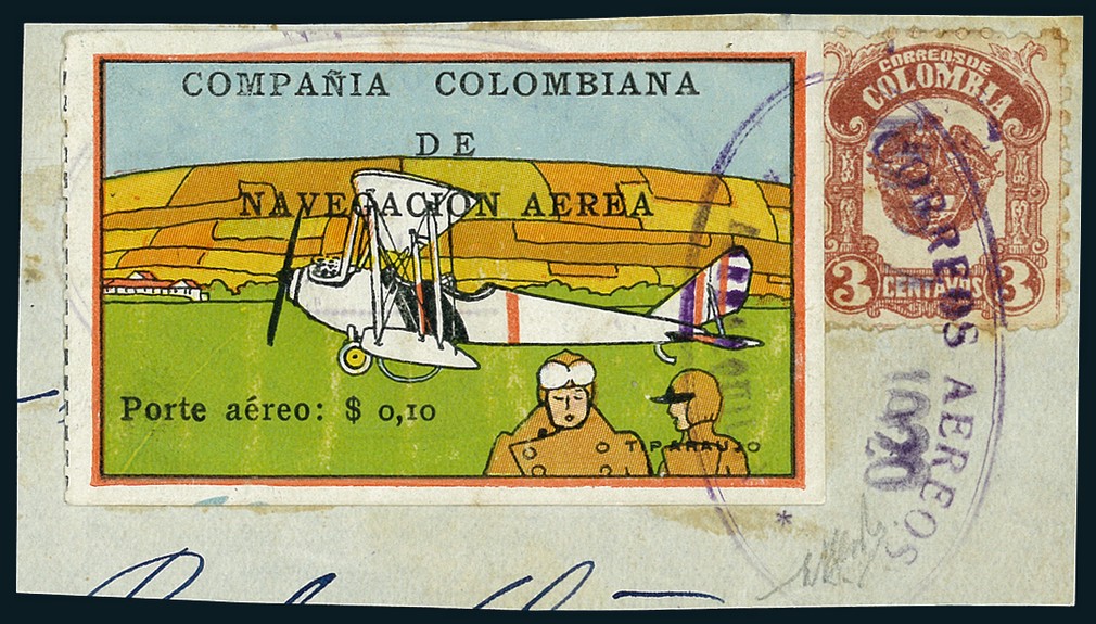 1920, 10c. "Plane at Rest; Pilot Foreground", used on piece and slightly overlapping Colombia 3c., tied by faint strike of "CCNA/Agencia Barranquilla" oval and smaller "Correos Aéreos/Mar 4 1920/Barranquilla" oval handstamps. Slight rubbing of little consequence. The just 13 used vignettes off cover recorded denote its considerable rarity. Signed Bloch and Enzo Diena. Scott C9. Ex Augusto Peinado.