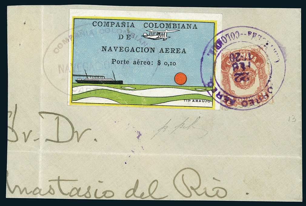 1920, 10c. "Ocean Liner and Biplane", negligible wrinkle in upper left corner, cancelled by "CCNA/Cartagena", and National Post 3c. tied by "Correo Aéreo./Cartagena-Colombia." c.d.s., both used on piece of cover carried on the First Flight of 22 February. Cert. P.F. (Rendon), signed Behr. Scott C10. Ex Eugenio Gebauer.