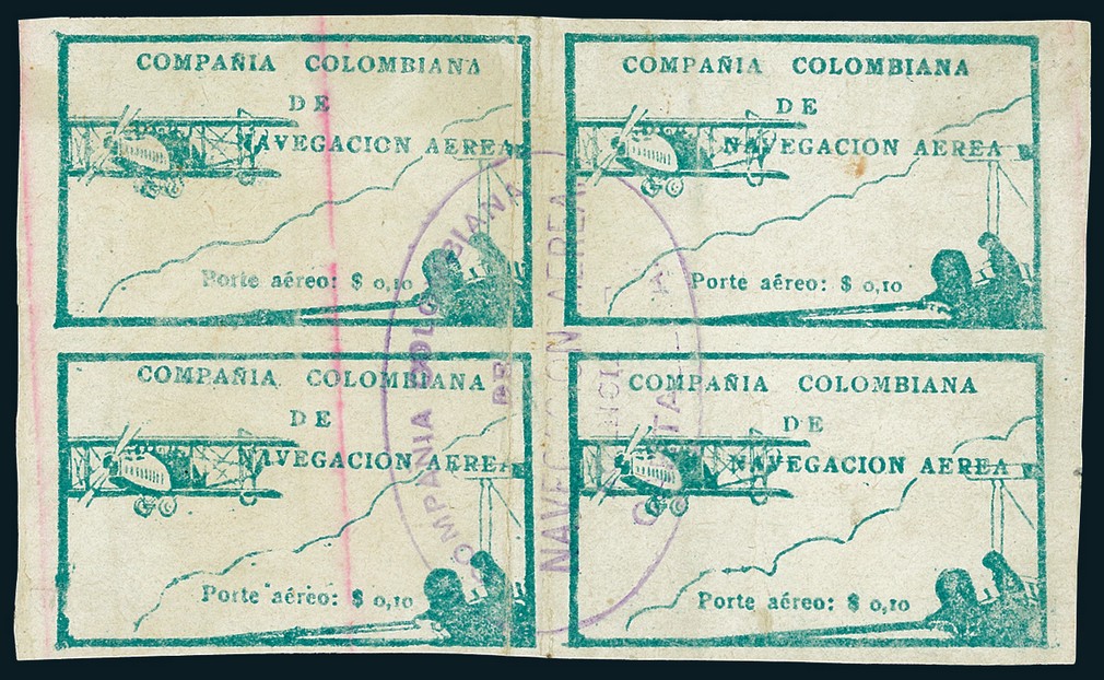 1920, 10c. green, selected group of nine stamps with three (unused) different types of the setting, two examples on piece, and block of four featuring the basic transfers with "CCNA/Cartagena" oval handstamp. Some imperfections as usually encountered, nevertheless a desirable group including a very rare block of four in used condition. Scott C11.