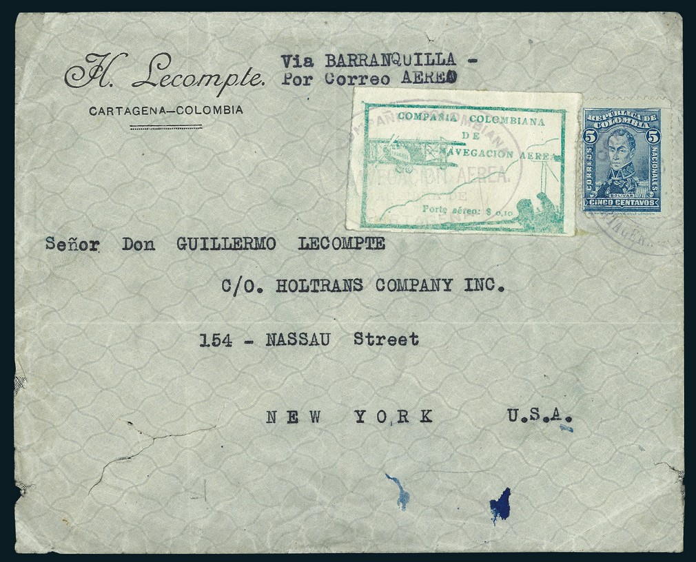 1920, March 6, Third Flight. Cover (upper back flap missing) to New York, flown from Cartagena to Barranquilla and then carried by maritime means to United States, franked by 10c. green tied by "CCNA/Cartagena" oval handstamp, with additional franking of 5 centavos to pay the national postage, tied by "Correo Aéreo./Cartagena-Colombia." c.d.s. Opened tear at base on front and couple of creases affecting the adhesive, of no importance for this unique item. This commercial cover does not only represent a very rare usage on the first day of issue, with only three covers known from this flight, but also the only cover known, bearing this issue, addressed to a destination outside Colombia; these comments clearly confirm the considerable significance and desirability of this cover. Cert. Rendon. Scott C11. Ex Jack C. Boonshaft.