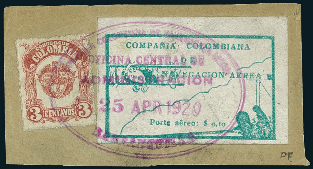 1920, April 25. 10c. green and National Post 3c., both tied to piece by "Agencia Colombiana de Navegación Aérea/Oficina Central de Administración/25 Apr 1920/Barranquilla" oval handstamp in purple. Horizontal crease of no significance for a unique item. The only philatelic proof so far in existence of this flight. Scott C11.