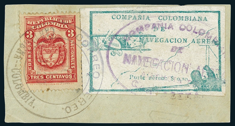 1920, June 9. 10c. green tied by "CCNA/Cartagena" oval, used on piece together with National Post 3c. with airmail c.d.s. on dispatch dated "Jun 9 1920", denoting the flight to Barranquilla by Capt. René Bazin. Small tear at base and couple of wrinkles mentioned for accuracy. Only this item and one cover are known from this flight. Scott C11.