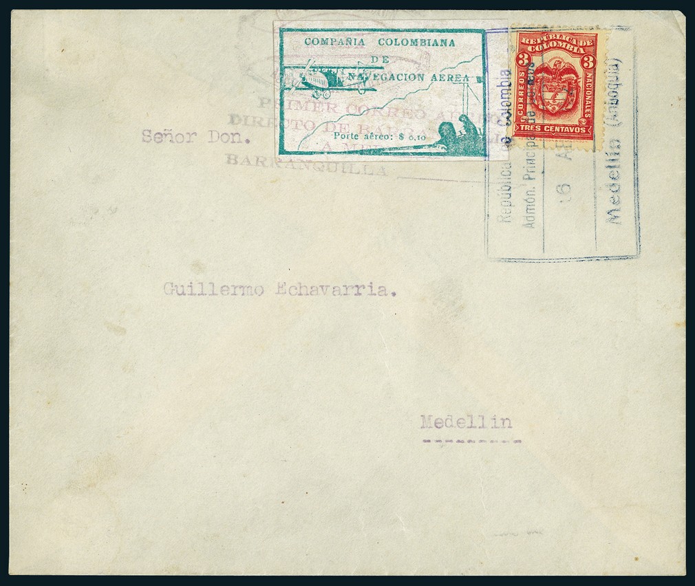 1922, April 16. Cover to Medellín, prepared for the "Goliath" flight but not flown, franked by 10c. green tied by four-line "Primer Correo Aéreo/Directo de Barranquilla/A Medellín/Barranquilla__" and ribbon "CCNA/Agencia Barranquilla" handstamps, with National Post 3c. cancelled by framed datestamp on dispatch. Scott C11.