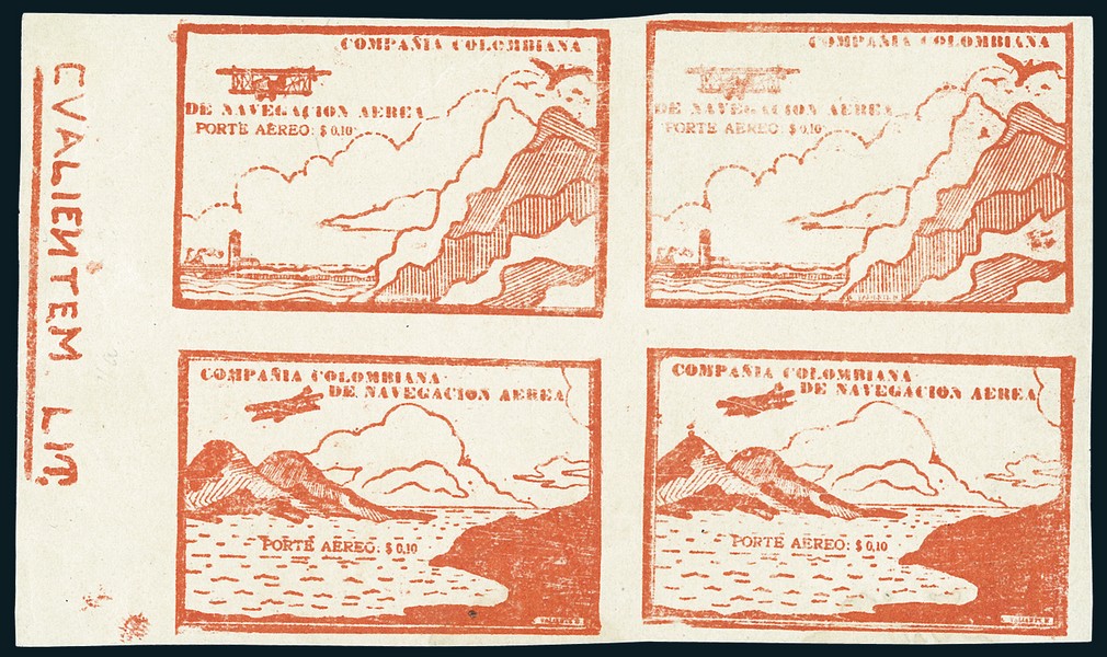 1920, 10c. green, trial printing in brick-red of the 10c. green value, featuring positions 55-56 / 61-62, showing left margin with imprint "CVALIENTEM. LIT.". Only one sheet was printed and fewer than five multiples are recorded. Extremely rare and desirable.