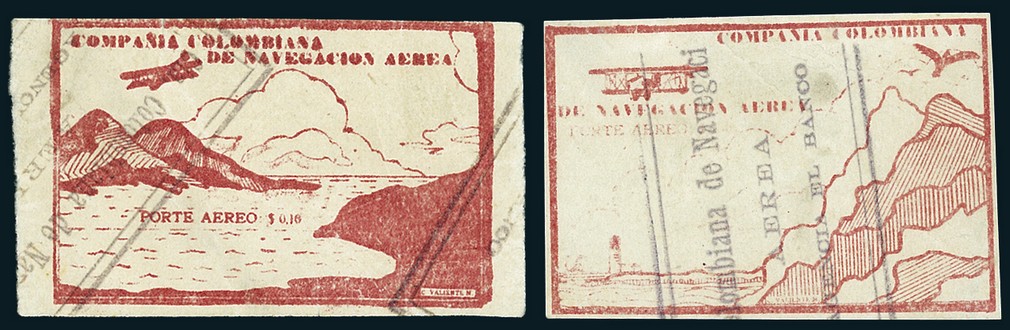 1920, 10c. brick-red, "Sea and Mountains" & "Cliff and Lighthouse", the two vignettes in this colour showing framed "Cía. Colombiana de Mavegación/Aérea/Agencia El Banco" cachet in violet. Minor imperfections as usually encountered in these stamps in used condition. Two of the three examples known bearing usage of any C.C.N.A. handstamp of El Banco. Gebauer 14, 15. Ex Eugenio Gebauer.