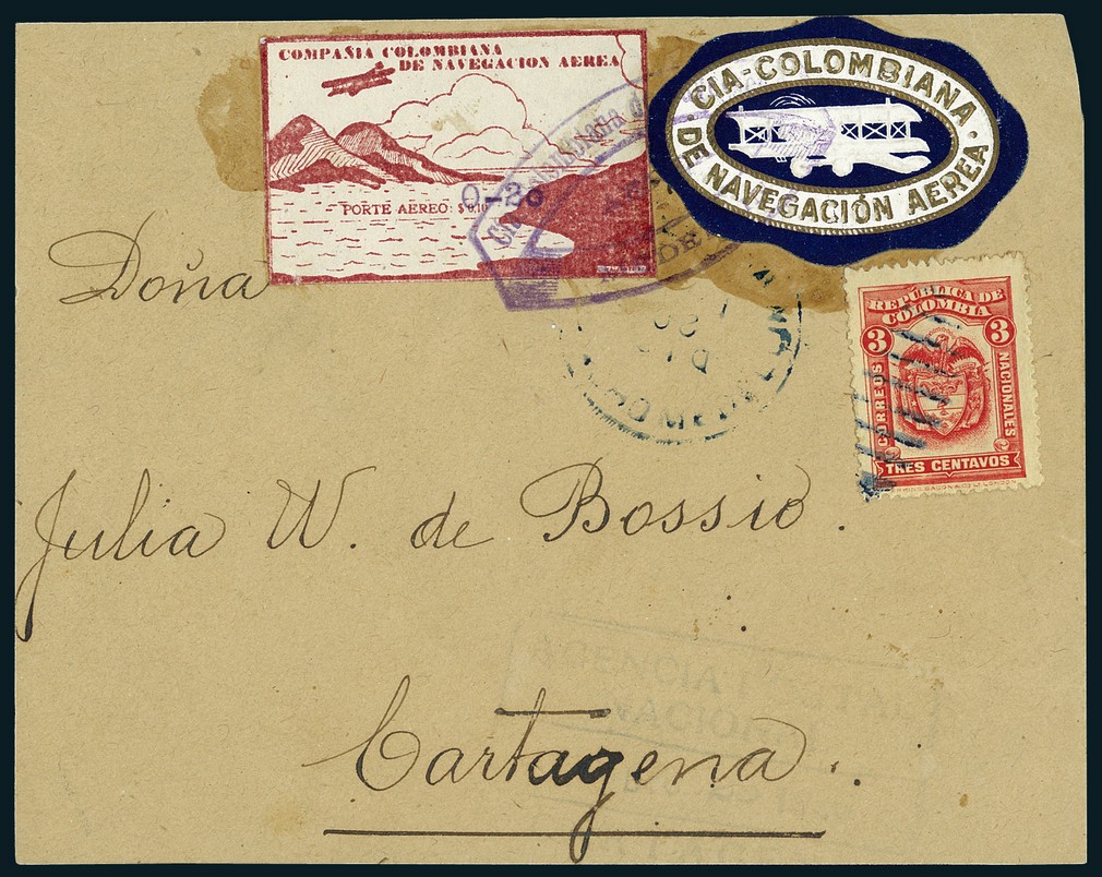 1920, Dec. 20. Cover (reduced at left) from Medellin to Cartagena, franked by "Sea and Mountains" 20c. on 10c. light brown-red, typewritten surcharge, cut-to-shape, tied by "Cía. Colombiana de Navegación/Aérea/Medellín" ribbon handstamp, uprated for national postage with 3c., tied by duplex datestamp of Medellin, which also ties this vignette and, at foot, part of "Agencia Postal Nacional/Cartagena Colombia" framed datestamp. A small number of vignettes were surcharged "0-20" and "0-30" with typewriter, and were to be used on the return flight of the "Medellín" from Medellín to Cartagena via Puerto Berrío. The plane, on its flight up-river, run out of fuel near San Bartolomé on the way to Puerto Berrío, after 3 hours and 30 minutes, and it was destroyed overnight by a storm. The few covers carried were consequently sent by surface mail for onward transmission. Taking into consideration the scarcity of the typewritten surcharge, and that only two covers are recorded bearing this provisional stamp, this is one of the extraordinary rarities of the early Colombian airmails. (The great visual appeal of this cover is also enhanced by the only application known on cover of the embossed "Cía-Colombiana/De Navegación Aérea" publicity label illustrated with a biplane, which was also tied on dispatch). Gebauer 21. Ex Jacobo Neuburger.
