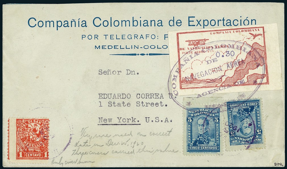 1920, Dec. 20-25. Commercial envelope from Medellín to New York, bearing a magnificent marginal-example of "Cliff and Lighthouse" 30c. on 10c. light brown-red, typewritten surcharge, tied by very elusive "Compañía Colombiana/De/Navegación Aérea/Agencia De/Medellín" large oval handstamp in violet, additionaly franked, for the single external rate, with two National Post 5c. cancelled by indistinct c.d.s. dated 25 December, which also passes through the "Hospital de San Vicente/Medellín" 1c. charity label. "Correos Aéreos/Cartagena" oval cachet on reverse applied to airmail. The only cover known bearing any vignette of this provisional issue and addressed to a foreign destination -its significance is reinforced by the fact that very few vignettes with typewritten surcharge were produced-, and the desirability of this cover is further enhanced by the very rare usage of the C.C.N.A. handstamp of the Medellín Agency (as also stated by Eugenio Gebauer in his catalogue on page 41). One of the greatest aerophilatelic rarities of Colombia. Gebauer 24. Ex Jacobo Neuburger.