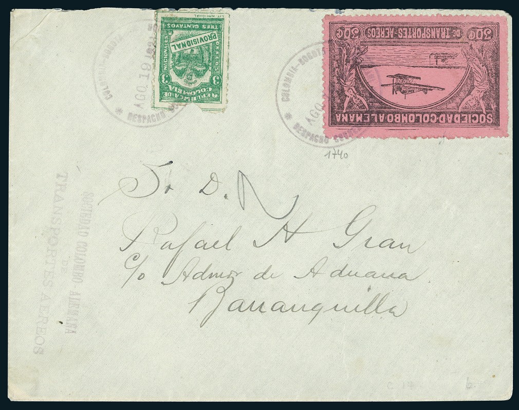 1921, Aug. 19, Experimental Flight. Cover from Bogotá to Barranquilla with 30c. black on rose and 3c. postage (faulty), each cancelled by circular "Despacho Correos Interior" datestamp, showing three-line SCADTA handstamp at left and backstamped on arrival. Scott C14.