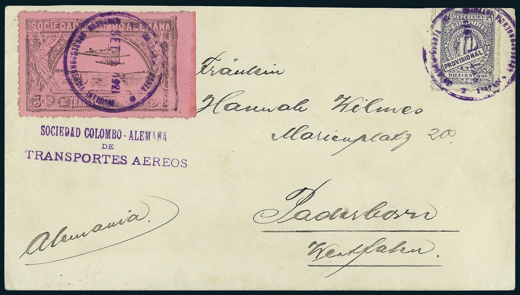 1921, Sept. 1st, Experimental Flight. Cover from Bogotá to Paderborn (Germany), flown to Barranquilla from where this mail was carried by ship to Europe, franked by 30c. black on rose, paying the international postage with 10c., each cancelled by c.d.s. on consignment, and alongside handstruck by "Sociedad Colombo-Alemana/De/Transportes Aéreos" three-line cachet. Scott 14.